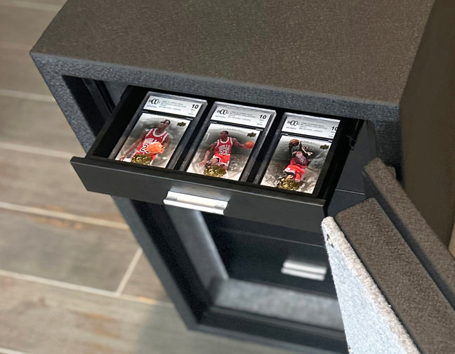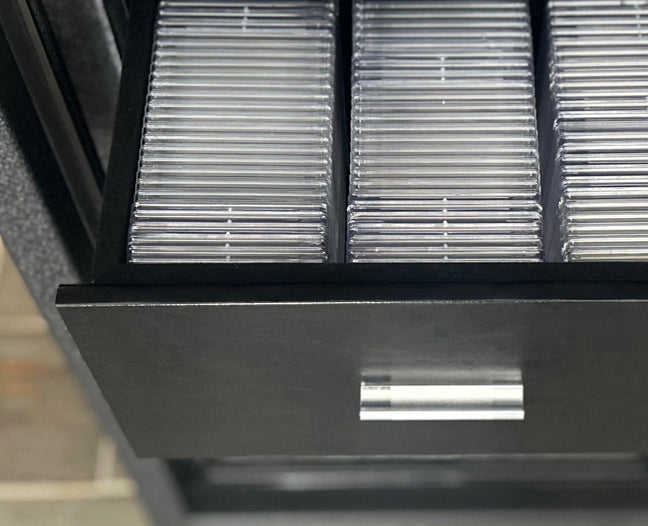 Maintain the organization of your valuable items while ensuring convenient access to your entire collection by utilizing the lower three drawers. These deep drawers are specifically designed for optimal storage and organization. Each drawer has the capacity to house up to 90 graded slabs or 399 top loaders. In total, this vault can accommodate 282 graded slabs, 1260 top loaders, or any combination of both.